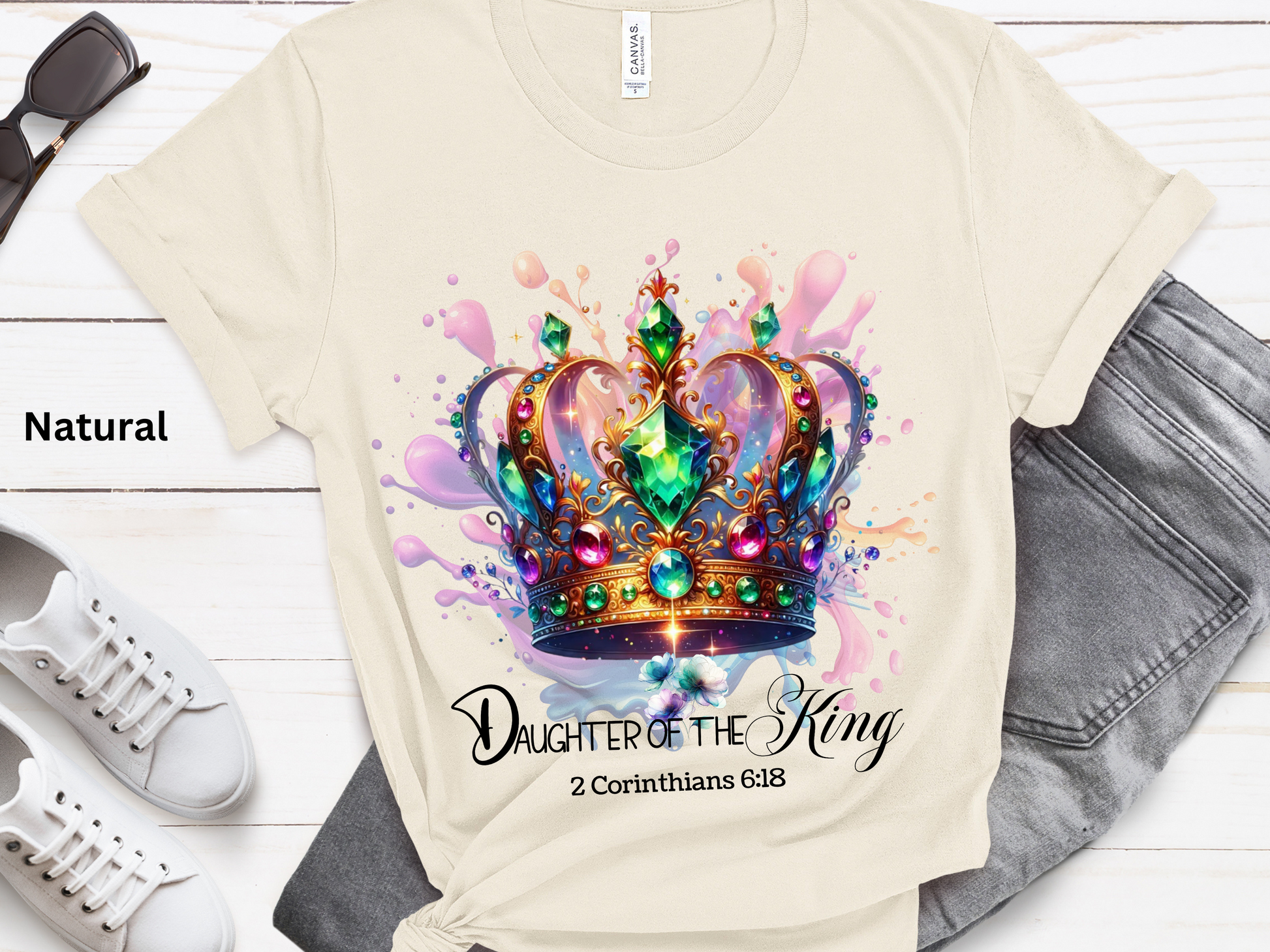 Celebrate your faith with this stunning Daughter of the King t-shirt! Featuring a beautifully designed jeweled crown with vibrant colors and 2 Corinthians 6:18, this Christian tee is perfect for women who want to express their love for Jesus. Made from soft, high-quality fabric, this faith-based t-shirt is great for everyday wear, church events, Bible study, or as a meaningful Christian gift for moms, sisters, and friends. Pair it with jeans or a skirt for a stylish and inspirational look.