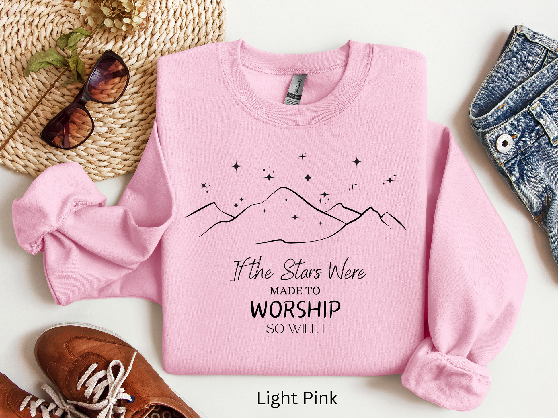 Embrace your faith and style with our "If The Stars Were Made To Worship So Will I" sweatshirt. This cozy and inspiring piece features a minimalist design of mountains and stars, symbolizing the beauty of worship and creation. Made from high-quality fabric, it's perfect for keeping you warm and comfortable while expressing your faith. Ideal for church gatherings, casual outings, or as a thoughtful gift for fellow believers. Wear your faith proudly and inspire others with this beautiful Christian-themed sweatshirt.